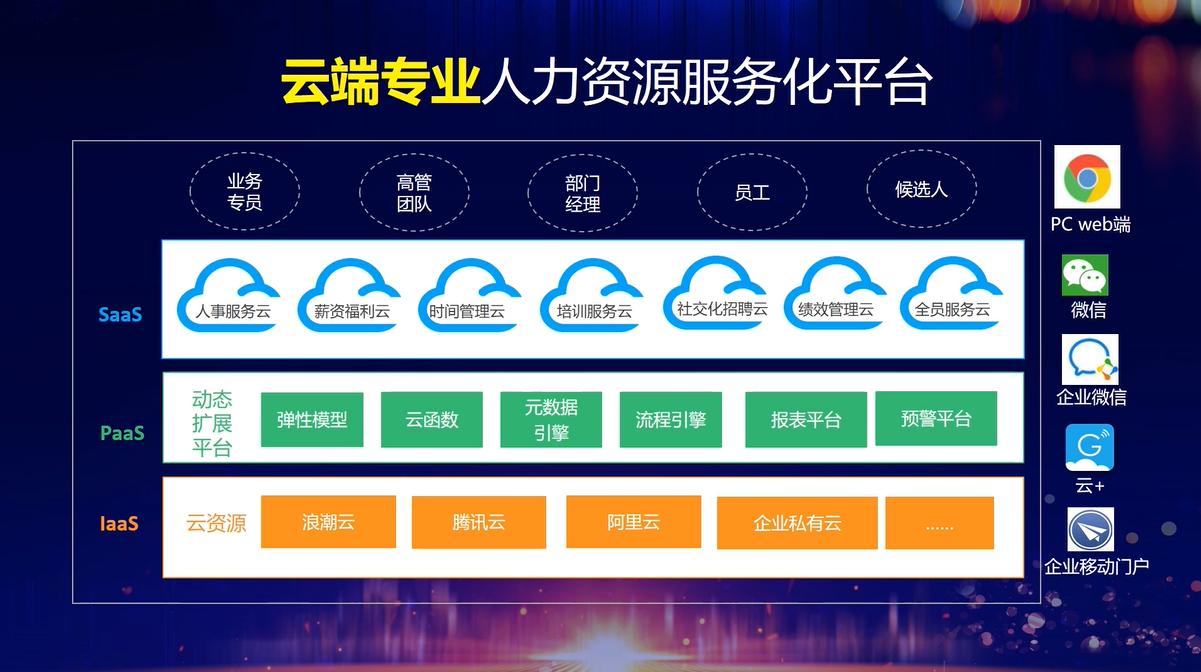 业务平台提供多级别的扩展模式;部署平台可实现从私有云到公有云无缝切换;扩展平台实现20万员工柔性扩展。