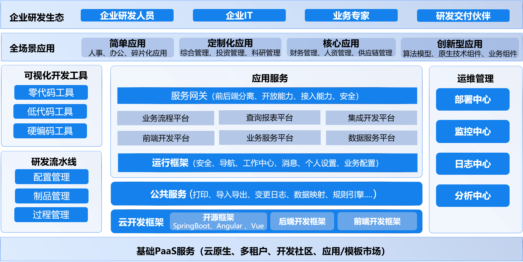 提供前端、API层、领域层、持久化层四层的组装能力,全面支撑企业应用柔性快速组装定制。 前端:开放共享的组件库及模板库、分层组装、微前端可组装框架; API层:可视化建模、自助开发调试、前后端分离、金融级边界安全;领域服务层:四层组装结构、可拆可合、领域驱动模型、事件驱动架构; 持久化层:插件化组装架构、全生命周期适配、业务查询语言引擎(BQL);