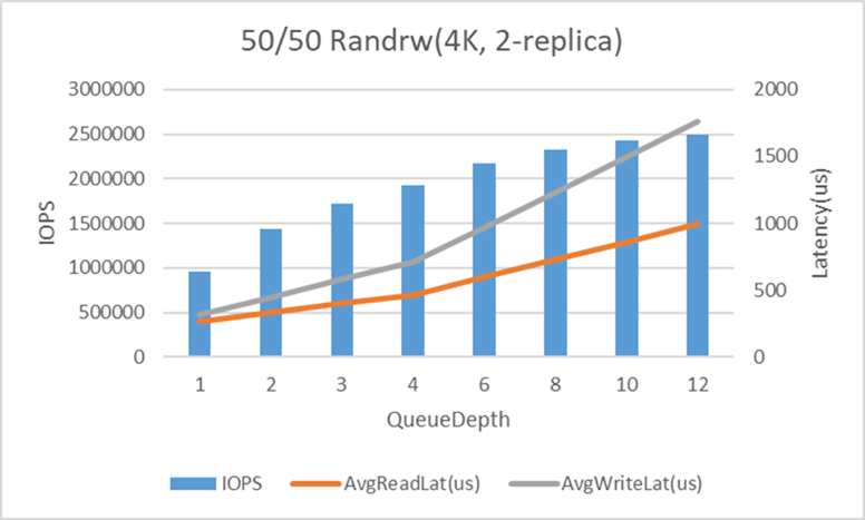 图5:4KB数据块,2副本,50/50混合随机读写性能测试
