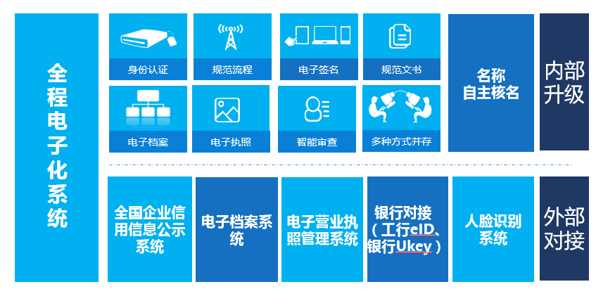 全程电子化商事登记平台主要实现五个方面的建设: