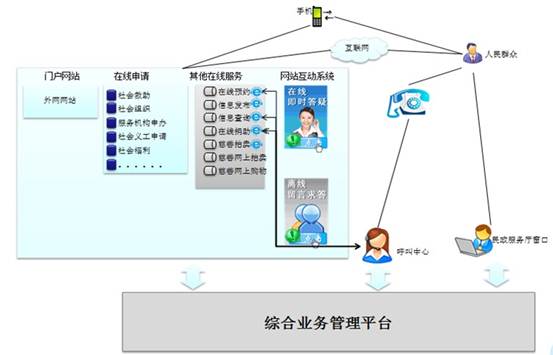公共服务平台基于互联网、移动通信等服务手段而建立的信息化服务平台。公共服务平台建立在综合业务管理平台之上,通过外网门户网站建立在线申请,网站互动及其他在线服务实现民政部门与民众的互通互信。