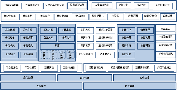 做到流程、记录、报表的统一,实现数据汇总分析,为企业提供准确、及时的记录数据支持。比如外部连接第三方三方仓库、物流平台,自动形成采购、销售、养护记录,提高效率。内部打通采购、库存、销售业务流程,实现业务统一及权限控制。