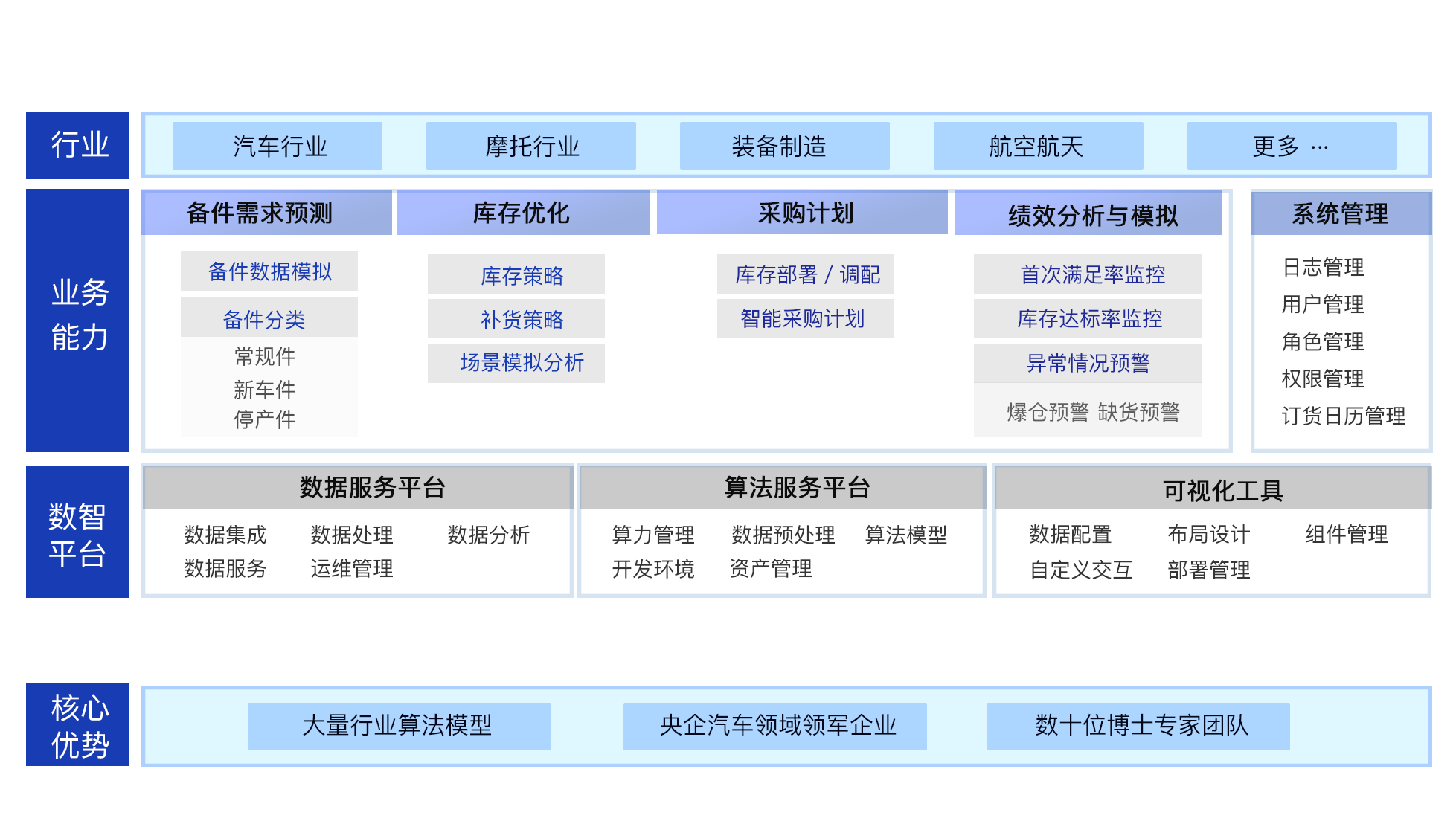 围绕备件业务场景,打造四大业务功能领域,为别为:备件需求预测,库存优化 青娱乐极品视觉盛宴,采购计划,绩效分析与模拟,以数智平台为基础三大引擎为支撑,打通售后备件供应链上下游,助力售后业务全方位提升。