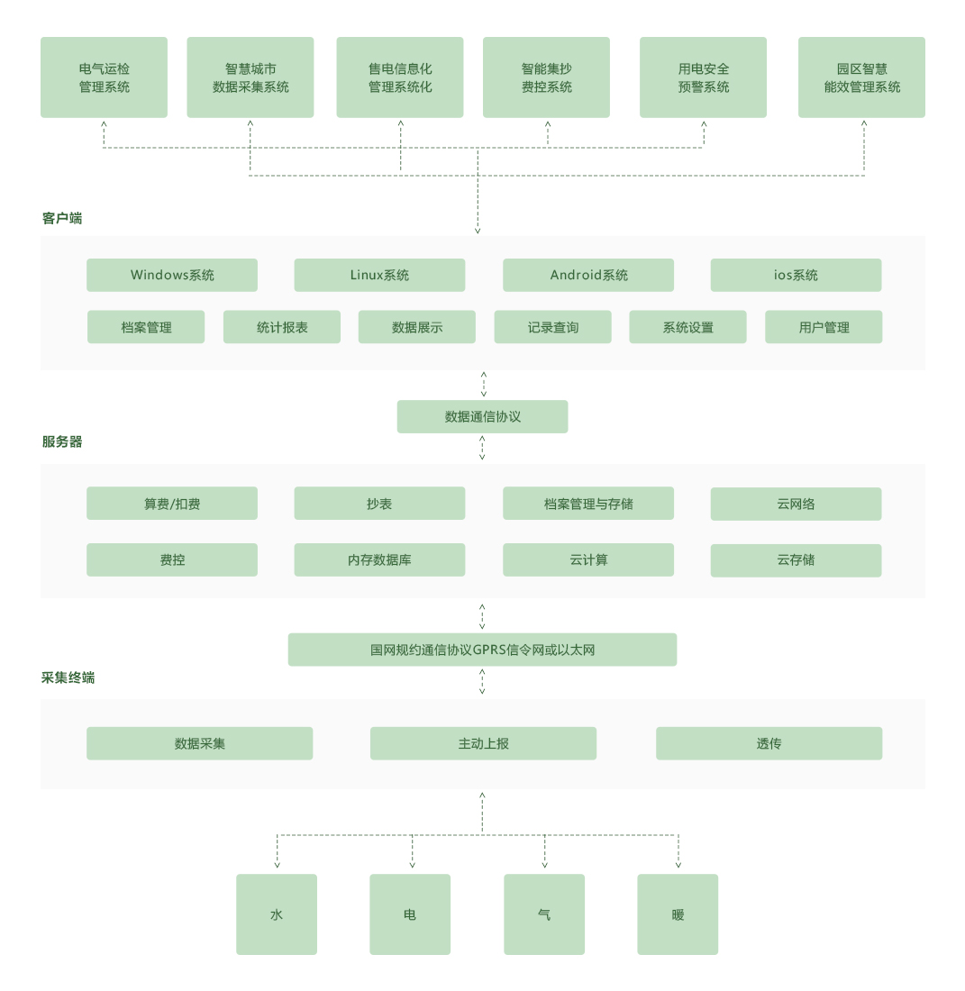 终端感知层提供主要是现场的水表,燃气表,热能表,以及安装在现场的智能电表,电气安全预警仪等,网络传输层主要是指提供工业网关,负责终端智能表计与平台应用层的连接,实时采集设备数据,上报到云上的物联网服务,平台应用层基于浪潮云工业互联网平台通用PaaS和工业PaaS服务搭建,提供面向能源管理领域的特定场景应用,其中,通用PaaS提供云计算,大数据,应用开发 亚洲欧美成人精品香蕉网,物联网等基础PaaS服务能力,工业PaaS通过浪潮企业大脑产品,面向各个行业和领域,提供以数据为核心的工业数据服务,机理模型服务和业务微服务,应用层提供安全预警,能耗管理,设备监控,无功管理,集抄费控等功能,服务安全用能,经济用能以及精细化管理的需求,同时支持PC端和移动端(IOS,Android)访问,满足不同用户群体使用需求。