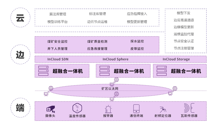 该解决方案重点采用了中心云+矿点“边缘云”模式,通过整合煤矿现有应用系统,规范数据传输标准以及采集企业重要信息,向下延伸涉及生产设备监控、井下人员定位、事故风险预警等一系列应用,通过实时的边缘计算完成本地视频分析,AI辅助决策等及时发现并处理影响煤矿安全生产的潜在风险;向上推进与集团公司、煤监局的联网工作,实现与省级煤监总局的事故风险平台的无缝对接,明确安全生产责任落实到企业各个具体层级、部门与人员,强化了安全生产标准化建设。