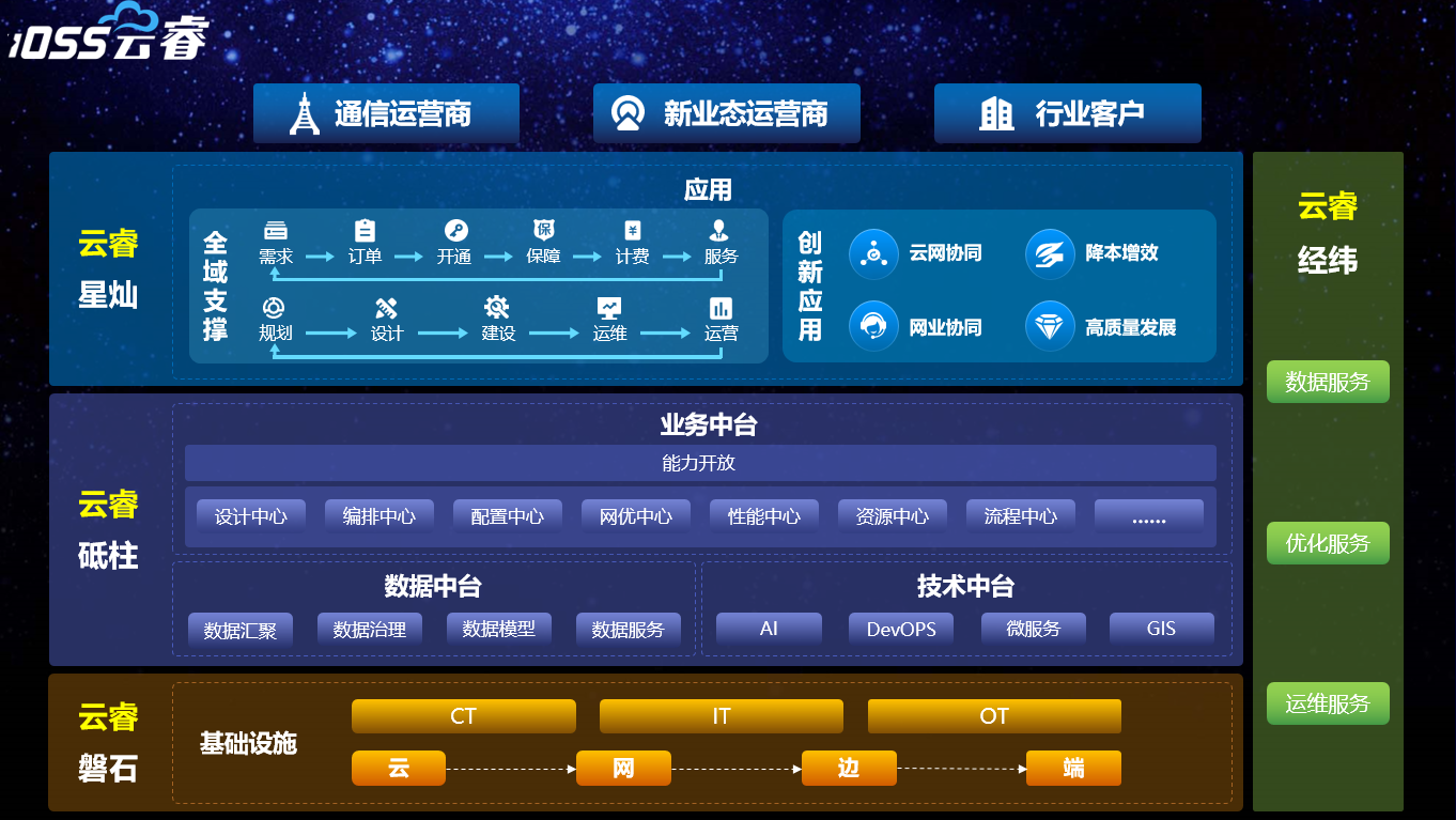 浪潮iOSS云睿包括4大方向,涵盖通信运营商所需要的核心场景和能力:云睿磐石,云睿砥柱,云睿星灿 青娱乐极品视觉盛宴,云睿经纬。