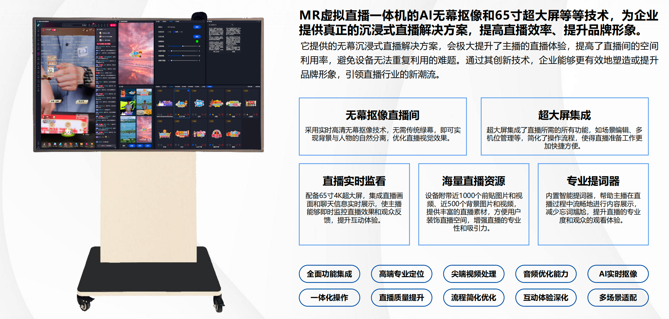 融合了导播,提词,直播间编辑等全面功能,定位于高端专业直播设备市场,该设备采用了尖端的视频处理技术,音频优化能力及AI视频实时抠像技术 电影区欧美电影,旨在通过一体化的功能整合和专业化设计,全面优化直播质量,简化直播操作流程并深化互动体验,它的推出明显提升了直播内容的制作水平,从而满足了不同领域从企业级到个人级用户的专业直播需求,适配于多样化的直播场景,浪潮虚拟直播一体机已成为提升直播效果,增强观众互动和优化直播体验的首选解决方案。