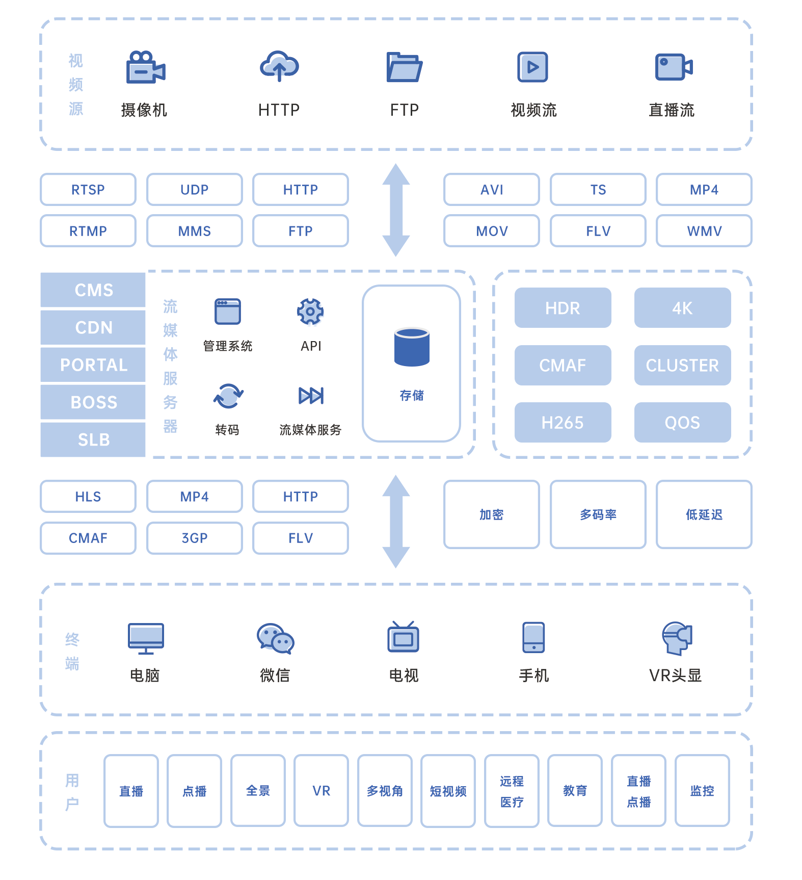 浪潮流媒体婷婷五月宗合一区二区采用先进的转码切片技术与标准的传输协议,提供高质量的画面、超低延时的音频与视频,能够为视频会议提供双向实时音像传输;能够为远程医疗提供连续、低延迟、高清晰的画面;能够为远程教育提供生动、实时、可交互的网上课堂;能够为视频点播提供高质量的视频服务;能够为监控提供低码率、实时、7*24小时的视频服务;能够为广告系统提供素材媒体存储和传输服务。