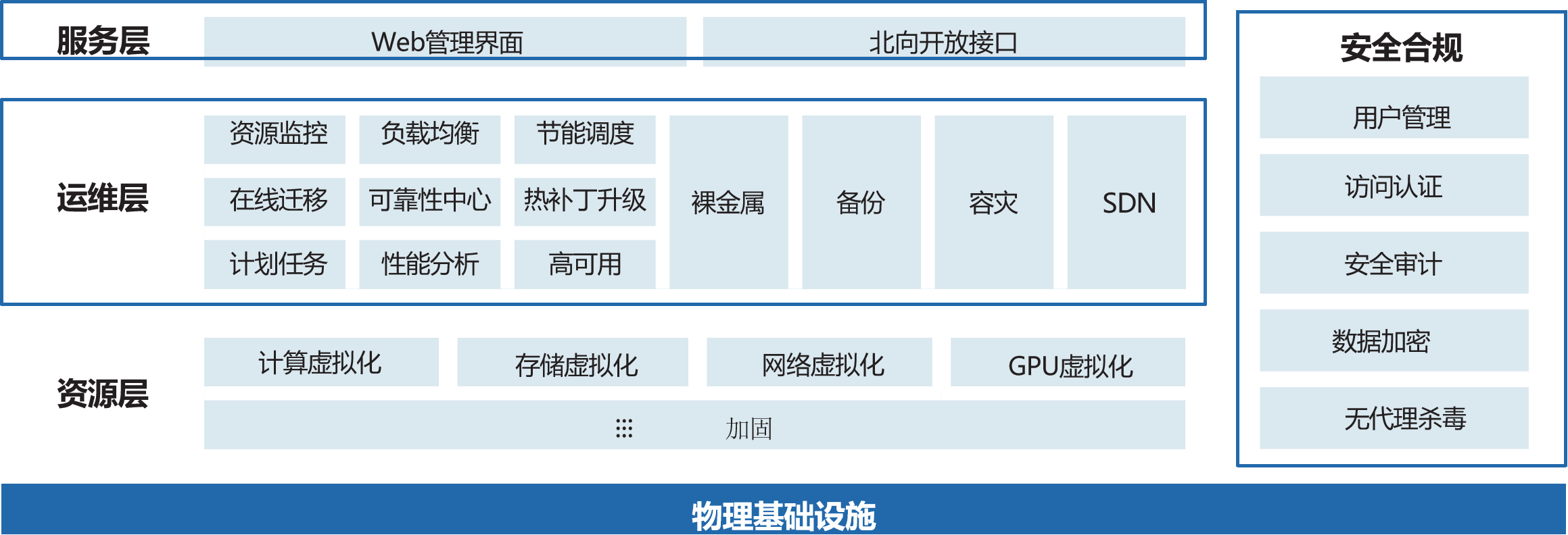 高性能、高密度,高效利用基础设施资源:基于异质存储的内存分层技术,单机虚拟机密度提升2倍以上,内核级vHost加速技术,将虚拟机单机性能提升至最高60万IOPS,不仅能以更高性能、更高密度承载更多核心业务,更能显著降低硬件成本。